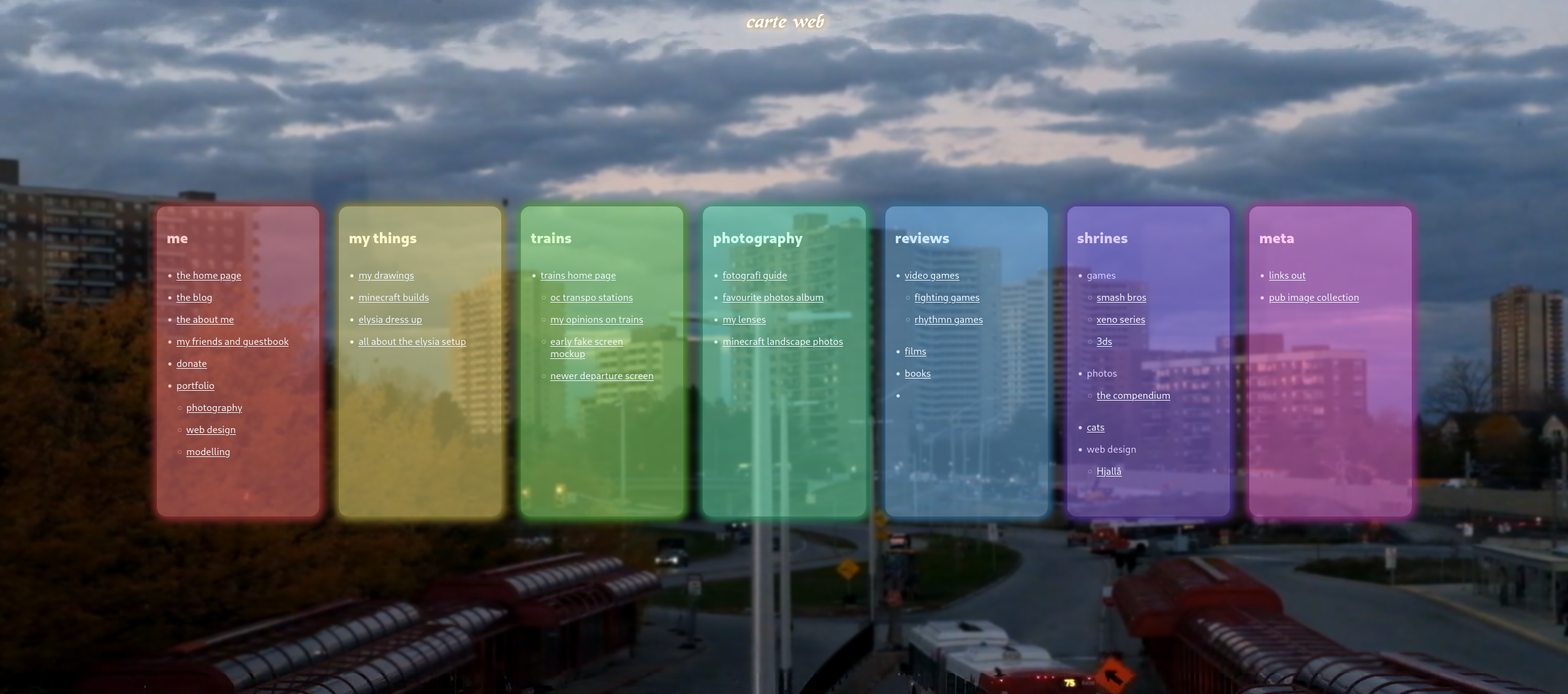 - **BRAND NEW SITE MAP** for finding all the new stuff. https://ely.pub.moe/site-map/ - film reviews - minecraft builds (wip) - train vehicles - ottawa stations (wip ) - my setup for things - lots of small updates to existing pages!